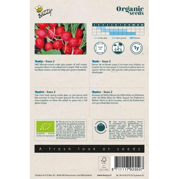 Kweek zelf je groenten met biologisch SKAL gekeurde zaden. Radijzen Saxa 2 zijn zacht van smaak en geschikt voor teelt in de volle grond.