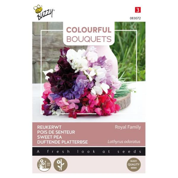 Reukerwten Royal Family behoren tot de heerlijk geurende éénjarige Lathyrus soorten. Het is een zeer gevarieerd kleurenmengsel dat rijkelijk bloeit van juni tot oktober in wit, rode, roze en paarse tinten. Met reukerwten kan je elke dag een boeket uit eigen tuin plukken.